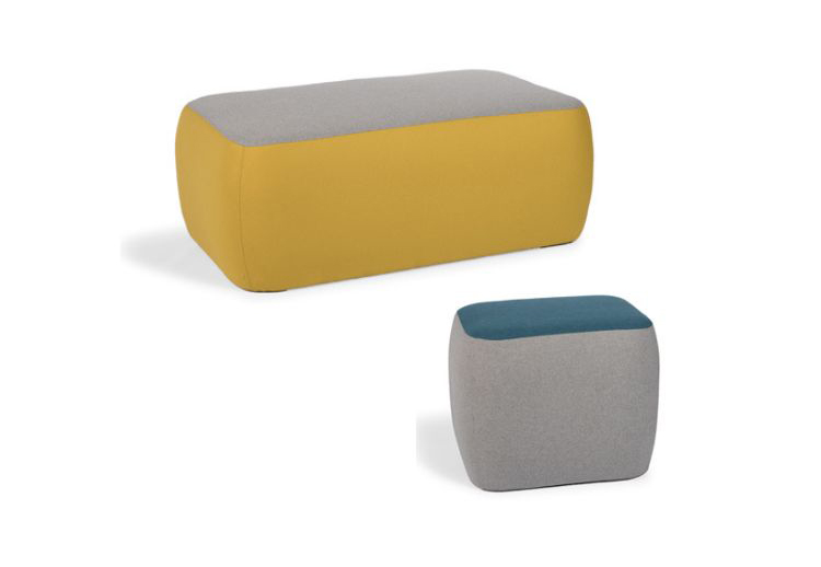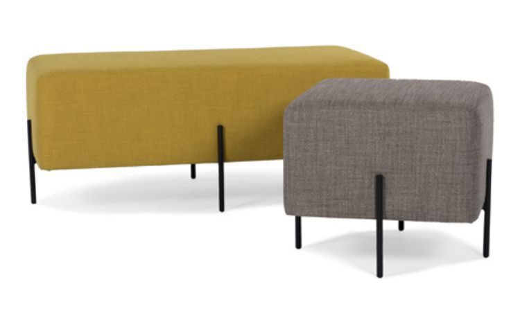 Contemporary paired ottomans, upholstered body with steel powder coated legs. Available in two sizes and a variety of powder coat finishes.