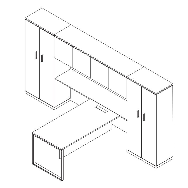 Executive two x hinge-door cabinets, executive worktop, overhead storage in glass or wood with pinboard and executive pedenza cabinet.